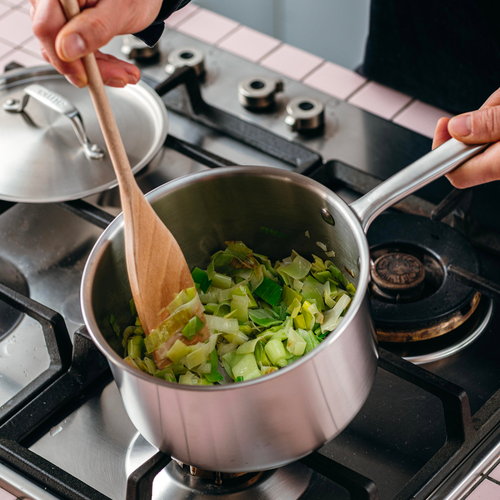- Always add a bit of fat, except for meat. Thanks to the excellent heat conductivity of our pans, meat can cook without added fat.