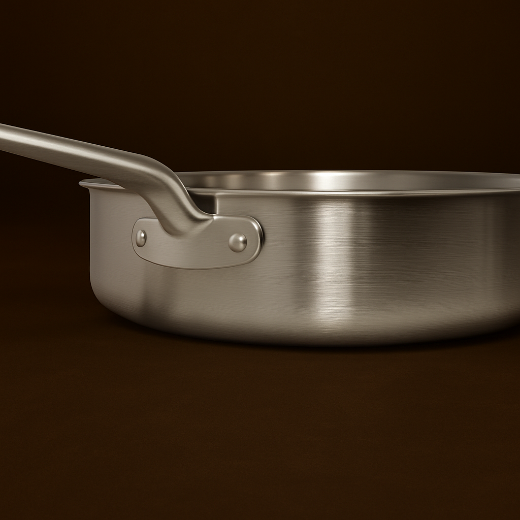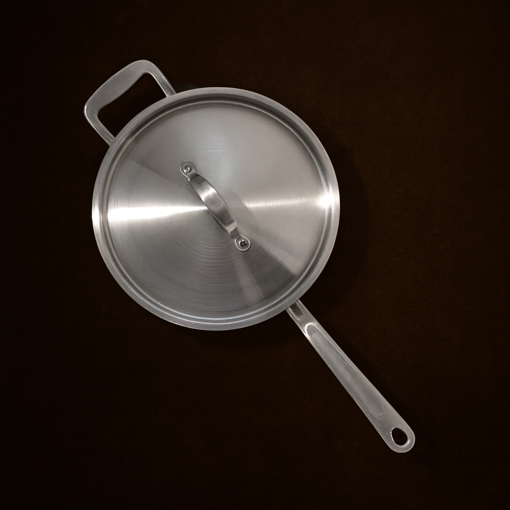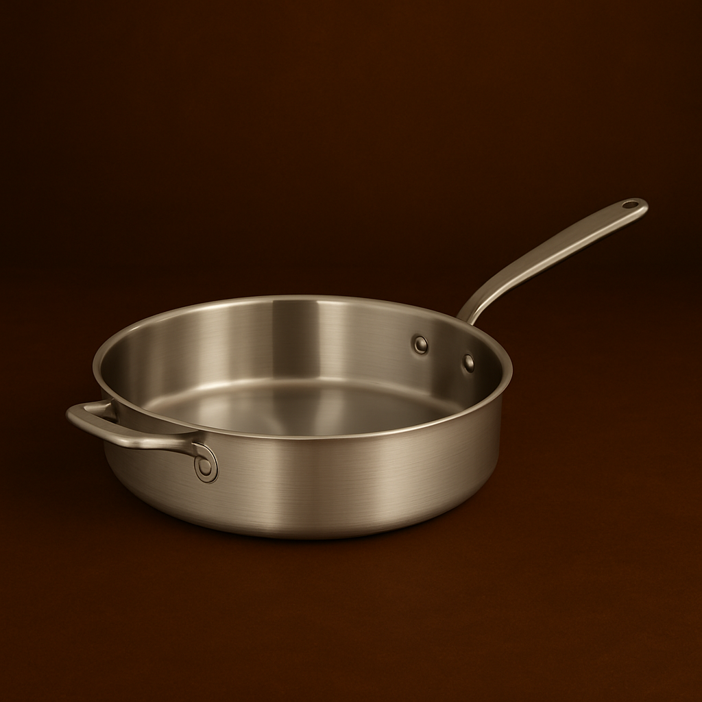 Stainless saute pan, completely free from chemical coatings, for healthy and flavorful cooking.